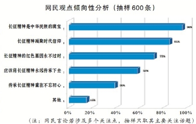 近期,长征精神引发舆论热议,网民纷纷在各大网络平台上发表自己看法。为了解网民对此话题的观点倾向性,以新浪微博、论坛、网页跟帖为样本随机抽取600条评论并进行归类总结,结果如下: